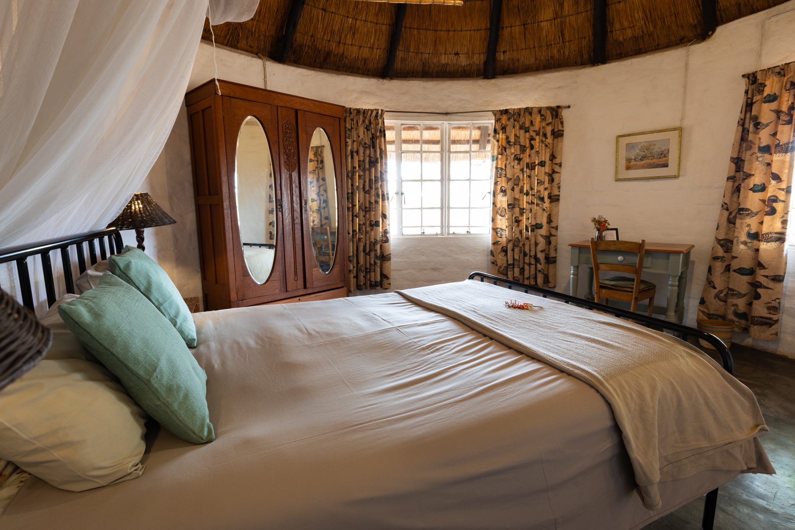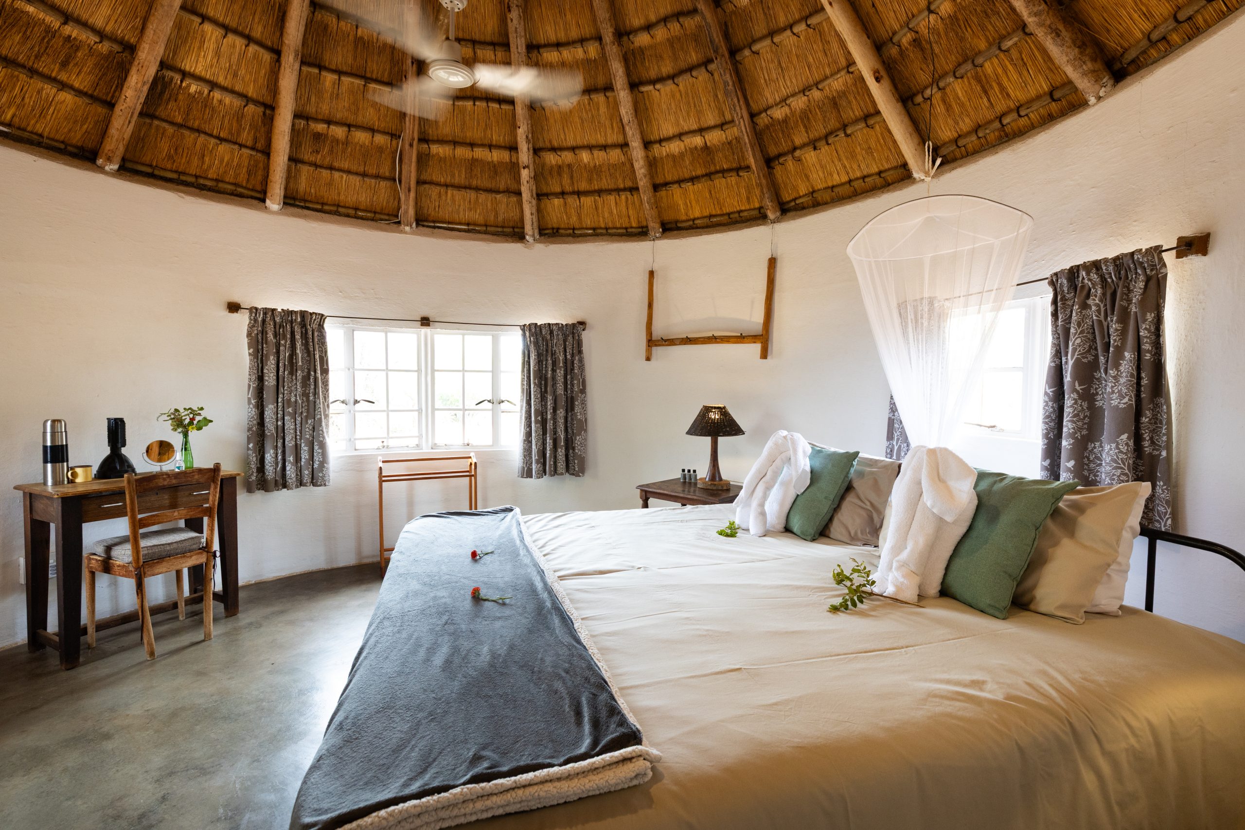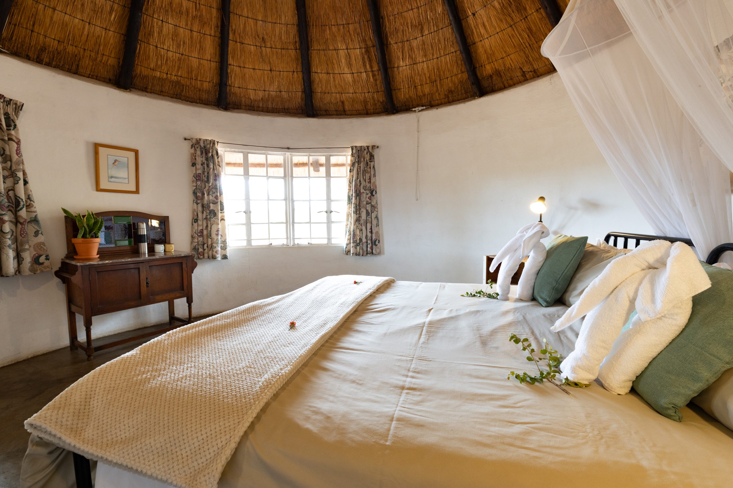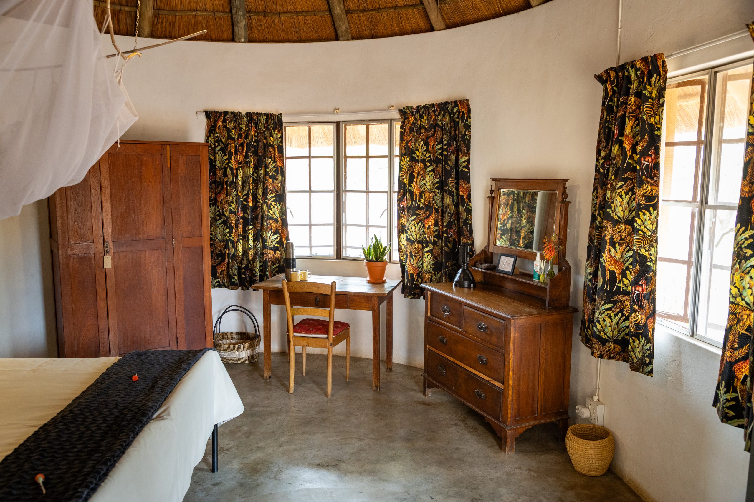 Guests are hosted in comfortable “Kruger- style” thatch rondawels, and there is also one large family style bungalow with two bedrooms and a shared bathroom. Our rate includes two safari activities per day, consisting of either game drives, walking safaris, tracking, bird watching and the like. Bush breakfasts, sunset picnics and other activities are available on request, please enquire for pricing. Packages are offered on a self-catered or catered basis.